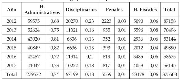 En lo que toca con los hallazgos fiscales se observa que, en porcentaje, oscilan aproximadamente entre el 4% en el 2015 y el 8% en el 2013, y los penales se mantienen en una tasa aproximada del 1%, pese a que en el 2012 fue su mayor incidencia con el 3% aproximadamente (ver tabla 1).