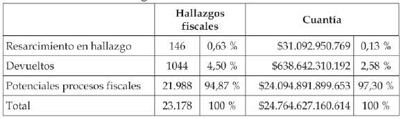 Siguiendo con el propósito del estudio, se encontró que entre el 1.° de enero de 2012 y el 31 de diciembre de 2017, se identificaron como producto de la vigilancia y del control fiscal un total de 23.178 hallazgos fiscales, por cuantía de $24.764.627.160.614. De este total, 146 hallazgos fiscales (0,63% aprox.) con una cuantía de $31.092.950.769 (0,13% aprox.) fueron objeto de resarcimiento del daño en etapa de hallazgo. También, 1.044 hallazgos (4,5% aprox.) con una cuantía de $638.642.310.192 (2,58% aprox.) fueron devueltos a proceso auditor por no contar con los elementos suficientes. En tales eventos no hay lugar a adelantar procesos de responsabilidad fiscal, razón por la cual ambas cifras quedaron excluidas del estudio.