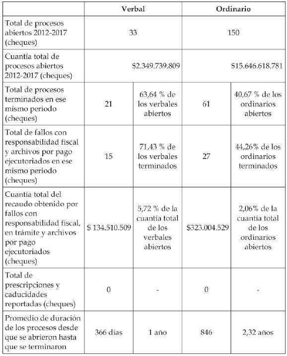 En el mismo periodo estudiado en casos anteriores y con base en la misma fuente de datos, tenemos que se dio apertura a 183 procesos de responsabilidad fiscal por el indebido uso o pago de cheques con recursos públicos. En términos porcentuales, el 22% del total de los procesos se tramitó por procedimiento verbal, y el 88% restante se tramitó por procedimiento ordinario. Se evidencia entonces que el procedimiento verbal superó en un 22,97% al porcentaje de los procesos terminados en ese mismo periodo por procedimiento ordinario. También superó en un 27,17% el porcentaje de los fallos con responsabilidad fiscal y archivos por pago derivados de procesos tramitados por procedimiento ordinario, en ese mismo periodo. Así mismo, superó en un 3,66% la cuantía total del recaudo obtenido por fallos con responsabilidad fiscal y archivos por pago y, por último, permitió decidir los procesos en promedio de 1,32 años antes que si se hubieran tramitado por ordinarios.