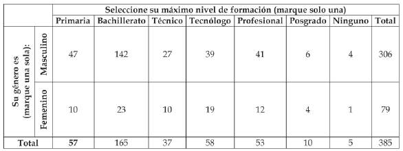 Con base al género del encuestado, y su nivel de formación, como se puede evidenciar en la figura 3, tanto hombres como mujeres presentan respuestas en todas las opciones de nivel de formación, siendo desde ningún nivel de educación formal, hasta posgrado.