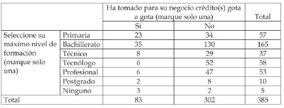 Como se puede apreciar, de la población que responde que no tiene estudios, el 60% ha accedido a créditos de gota a gota para la Mipyme, mientras que quienes tiene como máximo nivel de formación el grado de primaria, el 40,35% ha accedido a créditos gota a gota para la Mipyme. Respecto a los niveles de educación formal superiores al grado de primaria, en todos los niveles se encontró que (siendo administradores de la empresa) han accedido a créditos gota a gota; sin embargo, del total de la población para cada nivel, la toma de este tipo de créditos está entre el 10,34% y el 21,62%.