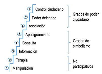 Los primeros escalones son manipulación y terapia; ambos describen una participación no verdadera. El objeto de estos niveles es permitir que los actores poderosos manipulen «educando» a los participantes. Los siguientes escalones, información y consulta, representan el nivel de simbolismo que permite a los participantes escuchar y ser escuchados, sin que esto represente un poder significativo que impulse al cambio del contexto actual. En el quinto escalón, llamado apaciguamiento, los actores poderosos aún retienen el cambio de las opiniones de los ciudadanos. De esta manera, la asociación permite a los excluidos negociar e intercambiar con los actores poderosos tradicionales. Finalmente, los escalones superiores son llamados el poder delegado y el control ciudadano; en ellos se dispone de mayor poder para la toma de decisiones o para el control total de la administración (Arnstein, 1969).