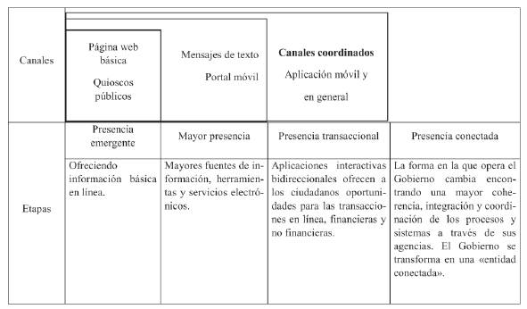 La Organización de las Naciones Unidas (2014) presenta la Encuesta Anual del Gobierno Electrónico sobre el desempeño del gobierno electrónico, que muestra el uso de cuatro canales para cada etapa de su desarrollo: «la importante necesidad de integración y optimización de canales se puede ilustrar a través de la visión de que los canales son puntos de contacto ciudadanos y estos deben jugar un papel complementario o complementario entre sí» (pág. 112). Véase el gráfico 3.