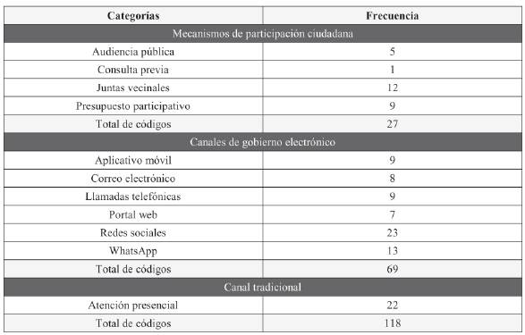 En el análisis de información se utilizó el software de análisis cualitativo (QDA) Atlas ti® para obtener un cuadro de frecuencias de las distintas categorías (conceptos y temas), mencionadas por los entrevistados. Estas categorías se agruparon por similitud de conceptos y temas en tres familias: mecanismos de participación ciudadana, canales del gobierno electrónico y el canal presencial. Se trabajó con un total de 118 categorías.