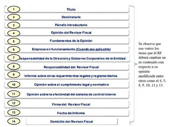 Así las cosas, a pesar de que la NIA 700 enuncia la palabra «auditor», cabe recordar que el RF deberá acatar lo dispuesto en las NIA y, además de esto, tener en cuenta lo dispuesto en el Decreto 2270, para emitir su dictamen con una opinión modificada. Para el RF el modificar una opinión en su dictamen implica que algunos aspectos del dictamen anterior pueden variar, como se evidencia a continuación (Figura 1):