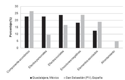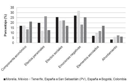 Las diferencias están en que las personas participantes de Morelia indicaron afectación a la salud y la atención a la enfermedad, las de Bogotá señalaron a la familia, los de Tenerife el que ocasiona suicidio, y los de San Sebastián desahucio (desalojo de viviendas por falta de pago). Otra diferencia se halla en los efectos personales: los de Bogotá incluyeron los problemas familiares (mas no consecuencias de tipo social), y los de Tenerife indicaron «el sentirse fatal y denigrado»; al igual, solo los de este último contexto mencionaron la migración como un efecto social. Además, solo los españoles señalaron como causas del problema a los políticos y al gobierno, ya que «no saben manejar la crisis». Y en cuanto al afrontamiento, los de Morelia y los de Tenerife consideraron propuestas de tipo grupal, como lo es la mayor organización de los trabajadores.