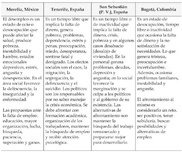 | Es la falta de trabajo y de oportunidades (con exceso de tiempo libre y estados de ocio), con implicaciones de escasez económica (pobreza, deudas, miseria, etcétera) dentro de un contexto nacional crítico, con efectos en lo personal (dependencia, desobligación, decadencia, irresponsabilidad, etc.), en lo social (delincuencia, inseguridad y marginación), genera además emociones negativas (depresión, estrés, preocupación, frustración, etcétera). Y afrontamiento a través de buscar apoyo; tratar de mantener una actitud positiva; considerar la posibilidad de desarrollar empleos en forma colectiva; mantener la búsqueda; considerar diversas formas para progresar y mantenerse productivo. | Es un tiempo perdido que genera pobreza y necesidades, es producto de problemas sociales como la desigualdad, falta de oportunidades, así como por causa del sistema social. Produce situaciones delictivas e impactos comunitarios; en lo personal genera problemas, necesidades, complicaciones y la vivencia de emociones negativas (tristeza, angustia, ansiedad y depresión). Se le considera un desafio que lleva a destacar las responsabilidades que se tiene hacia la familia, mas no se específica alguna alternativa de su afrontamiento. | Es un tiempo libre, desocupado y desperdiciado que genera pobreza, deudas y precariedad. En lo personal produce inestabilidad, dependencia, falta de desarrollo, insatisfacción de necesidades; además de emociones negativas como ansiedad, depresión, desesperación y angustia. En lo familiar puede provocar problemas como divorcios y falta de estudio en los hijos; en lo social, vagancia y suicidio. Además, hay pocas oportunidades de empleo para la población estudiantil. Las formas de afrontamiento al mismo son buscar empleo con esfuerzo y humildad así como migrar a otros países. |