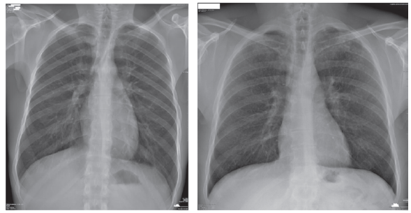 Imagen 1 Diferencia entre radiografía de tórax con técnica OIT en profusión 0/0 y 1/1. Imágenes gentiliza de reproducción del Dr. Anselmo López Guillén y Dr. Sergio Rovira Sans.