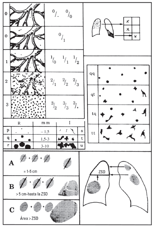 Gráfico 1 Guidelines for the Use of the ILO International Classification of Radiographs of Pneumoconioses» (Edición revisada 2022), es una herramienta importante utilizada por expertos en salud ocupacional para evaluar y clasificar radiografías de tórax en relación con las neumoconiosis, que son enfermedades pulmonares causadas por la inhalación de polvos y partículas en el lugar de trabajo.