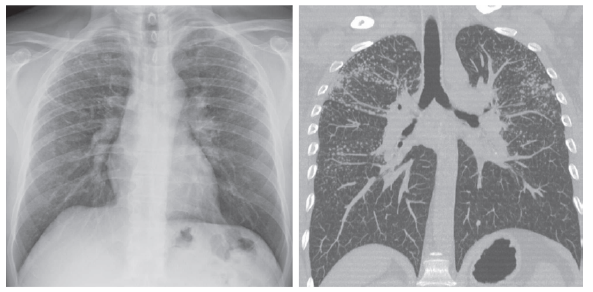 Imagen 2 Diferencia entre radiografía de tórax con técnica OIT y Tomografía computadorizada de tórax de alta resolución (TCAR). Imágenes gentiliza de reproducción del Dr. Anselmo López Guillén y Dr. Sergio Rovira Sans.