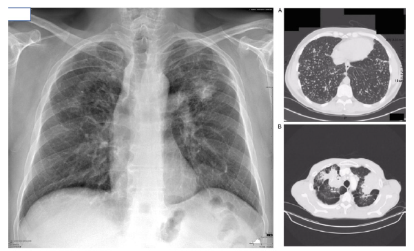 Imagen 3 Diferencia entre radiografía de tórax con técnica OIT y Tomografía computadorizada de tórax de alta resolución (TCAR), en la imagen A opacidades redondas confluyentes típicas de silicosis y en la imagen B coalescencia de opacidades redondas con formación de silicomas que puede caracterizar una fibrosis pulmonar masiva en curso. Imágenes gentiliza de reproducción del Dr. Anselmo López Guillén y Dr. Sergio Rovira Sans.