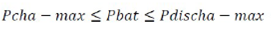 Donde Pcha-max es la potencia de carga máxima permitida, y Pdischa-max es la potencia de descarga máxima permitida. Pbat es positivo cuando se descarga, y negativo para la carga. Ahora bien, el estado de carga SOC en el momento de descarga en un lapso de tiempo (delta de tiempo) se puede definir como: