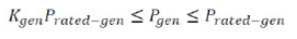 Donde Prated-gen es la potencia nominal de salida, Pgen es la potencia de salida real y F0 y F1 son los coeficientes de ajuste de la curva de consumo de combustible. Basándose en los valores recomendados de [7], F0 se establece como 0,08415 y F1 es 0,246. Los generadores diésel suelen tener límites de potencia que pueden expresarse como: