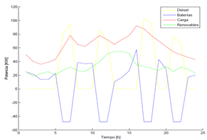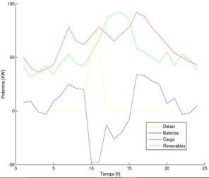 En la gráfica anterior se nota cómo aumentó el uso del generador diésel, el cual tiene como potencia de salida un valor mayor a 100 KW, y las baterías con respecto al caso anterior, disminuyen su tiempo de funcionamiento, ya que existe un valle entre las horas 11 y 15 que no existía en el caso anterior.