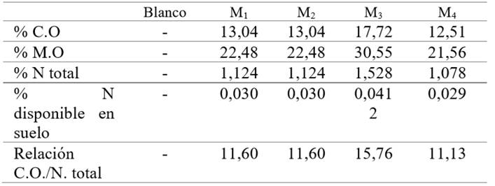 Al analizar la relación C/N en cada uno de los tratamientos de la presente investigación, se puede afirmar que tanto para el blanco como para los tratamientos M1 y M3, es alta y para el tratamiento M2, es muy alta como se puede notar en la Tabla 3. La adición de pilas a cada uno de los tratamientos modifica sustancialmente el contenido de carbono orgánico en el suelo, siendo las pilas alcalinas el que más lo modifica. Cabe aclarar que, de acuerdo con las características visuales de los tratamientos, el carbono que aportan las pilas no fue totalmente asimilado, pues al tacto manchan la piel situación que no ocurre cuando se tiene un suelo rico en humus o materia orgánica.