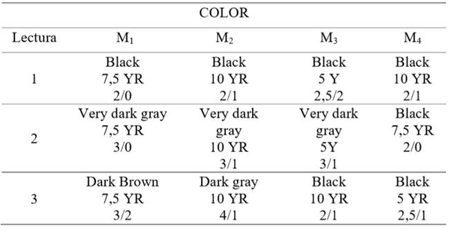 Para el caso particular de la presente investigación, el color de cada una de las muestras fue analizado con una muestra seca al horno y determinado con la notación Munsell. Como se puede observar en la Tabla 5, el color tanto del blanco como del tratamiento 1, es gris muy obscuro, siendo la materia orgánica la principal responsable de este color. El color tanto para el tratamiento 2 como para el tratamiento 3 es negro, siendo la materia orgánica y el carbono de las pilas alcalinas y pilas genéricas las responsables de este color.
