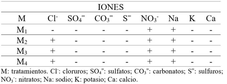 Determinación de iones en extracto acuoso. La determinación de algunos iones (cloruros, nitratos, sulfatos, carbonatos, sulfuros, calcio, sodio, potasio) en extracto acuoso, fueron determinados mediante un tamizaje químico de acuerdo con la metodología de Álvarez R. y otros [17].
