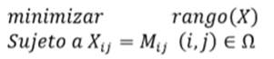 Como una matriz (M) de bajo rango se puede aproximar por medio de la descomposición de valores singulares (SVD, Singular Value Descomposition), Emmanuel Candes [20] plantea la solución para encontrar los datos perdidos a partir de una matriz de bajo rango genérica.
