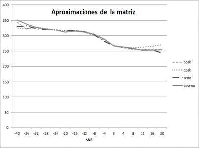 Un aspecto importante en la ejecución del algoritmo es tiempo que tarda en generar la matriz aproximada, en la Fig. 10 se observa que se requieren más de 300 aproximaciones en SNR inferiores a -8 dB y esta se reduce a 250 aproximaciones en SNR superiores a 8 dB, nuevamente el algoritmo presenta mayor velocidad al recuperar muestras perdidas en buenas condiciones de canal.