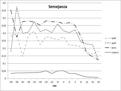 La correlación cruzada indica que para los cuatro tipos de señal se observa mayor similitud si la señal tiene una SNR superior a 2 dB. Cabe aclarar que un valor de cero significa similitud total y valores superiores a 0.4 diferencias entre la señal original y la recuperada.