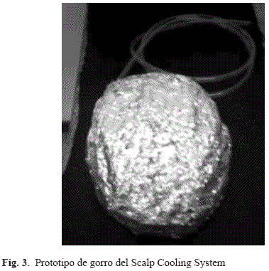 Se diseñó un gorro dentro del cual se instaló un serpentín de cobre cubierto con aluminio y lycra. A él va conectada una manguera que transporta el liquido refrigerado (Fig. 3).