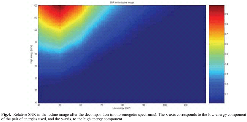 Fig. 4 shows the graph resulting from the noise propagation analysis performed in MATLAB 7.0. The mono-energetic pair (within the range tested) yielding the lowest amount of noise in the iodine image was 50 keV / 120 keV. Fig. 5 displays the images obtained after performing the decomposition algorithm with the pair of mono-energetic beams mentioned above and with no noise added. The window was set to [01] for all the images, where white corresponds to 1 and black to 0.
