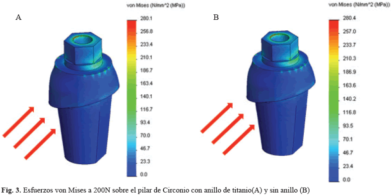 En el modelo con anillo, el pilar de Zirconio, mostró un esfuerzo von Mises de 280,1 MPa, concentrado en el anillo de titanio en vestibular y en la parte interna del hexágono donde se ubica el tornillo, Fig. 3.
