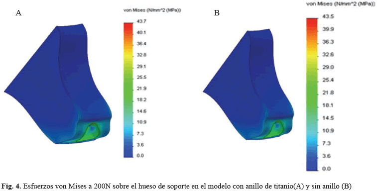 En el modelo con anillo, el hueso de soporte mostró un von Mises de 134,4 MPa concentrado en palatino a nivel de la plataforma del implante. El hueso a esta magnitud de carga, superó su módulo de elasticidad y comenzó a mostrar deformación plástica. En el modelo sin anillo, se observó un von Mises de 139,8 MPa localizado en la plataforma del implante. El hueso a esta magnitud de carga, también superó su módulo de elasticidad y comenzó a mostrar deformación plástica.