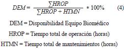 En publicaciones anteriores [12], se tiene un ejemplo claro para este indicador. Si un equipo del Laboratorio Clínico pudiera ser utilizado en este servicio, programado de lunes a viernes en el horario de 8:00 AM a 11:00 AM, este equipo deberá estar 15 hrs. disponibles a la semana y 15 x 52 = 780 horas al año. Si el equipo estuvo de baja desde un jueves a las 10:00 AM hasta el siguiente lunes a las 9:00 AM, el equipo incumple su plan de disponibilidad en 5 horas, entonces: Porcentaje de disponibilidad = 775/780 x 100 = 99 %.