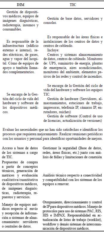 Asociando lo visto dentro de la recopilación bibliográfica, se obtuvo un total de 6 funciones que agrupan las responsabilidades que tiene un DIM en una institución hospitalaria. En la Fig. 1 se puede observar la clasificación en cuestión: