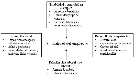 A continuación se presenta el marco conceptual para abordar la calidad del empleo, el cual si bien constituye una referencia importante para el estudio, a todas luces no puede ser satisfecho por el estudio empírico nacional, el cual resulta limitado por el diseño y disponibilidad actual de la información. El estudio sólo aborda cuatro indicadores como expresión de iguales dimensiones de la calidad del empleo, a partir de las estadísticas disponibles por las encuestas de hogares: los ingresos, la estabilidad en el empleo, la jornada laboral y la seguridad social. No obstante, la calidad del empleo incluye una gama más amplia de dimensiones, las cuales demandan otros estudios con fuentes diversas de información, especialmente en lo que se consideran los elementos subjetivos del trabajo.