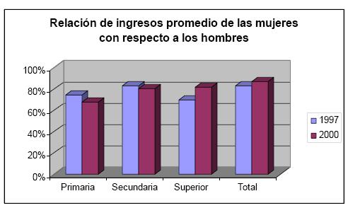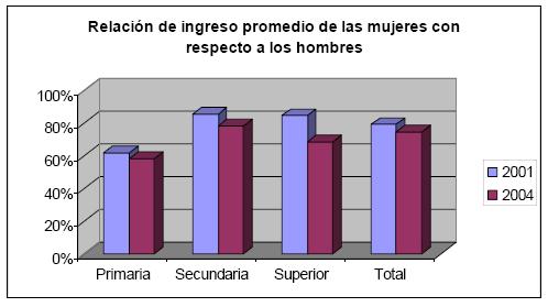 En cuanto a los ingresos promedio de hombres y mujeres, en lo transcurrido del período 2001–2004, y en un contexto de lenta recuperación de los principales indicadores del mercado laboral, se revirtió un avance logrado durante el período anterior (1997–2000), y la brecha de ingresos promedio de las mujeres con respecto a los hombres se amplió de 21% a 25%. Esta ampliación de la brecha de ingresos se presenta simultáneamente con un incremento de la proporción de mujeres calificadas dentro del total de ocupadas. Esto es, la fuerza laboral femenina ocupada eleva su nivel educativo a cambio de una reducción de sus ingresos con respecto a los hombres. Efectivamente, la brecha de ingresos se amplió para todos los niveles educativos, pero esta ampliación es especialmente aguda para los niveles de educación superior, la cual pasó de 16% a 32%. Así, mientras en el período anterior de crisis económica de finales de siglo, es el grupo de mujeres profesionales el menos perjudicado relativamente en empleo e ingresos, durante el nuevo siglo con una relativa estabilidad y crecimiento económico es este mismo grupo el que más crece en empleo, pero el más afectado en ingresos.