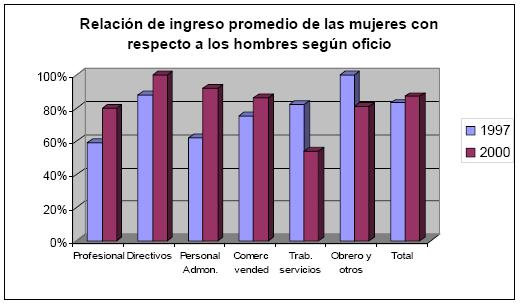 El hecho preocupante se presenta en la categoría de los y las trabajadoras de los servicios, sector que ocupa el 35% del total de trabajadoras, dado que la relación de ingresos perdió 28 puntos en deterioro de los ingresos relativos de la mujer, al pasar de representar el 82% del ingreso de los hombres en 1997 a sólo 54% en el 2000. Dada la presencia tanto de componentes formales como informales en esta categoría, no puede pensarse que esta caída corresponda sólo al deterioro del ingreso de las mujeres vinculadas a actividades de servicios informales.