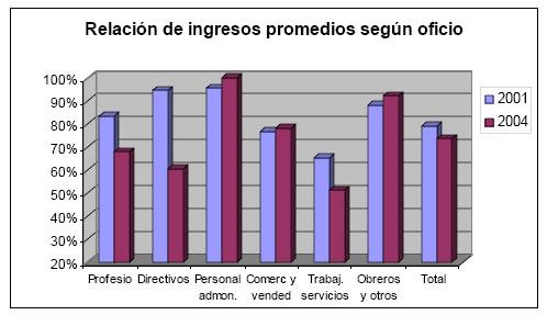 Para los primeros años del presente siglo se mantiene la estructura de la distribución de ocupados y ocupadas por oficios. En términos de ingresos por el contrario se presenta un deterioro significativo de los ingresos relativos de la mujer con respecto a los hombres, especialmente en las categorías más altas de la jerarquía ocupacional, esto es, en los profesionales y el personal directivo. Para el primer grupo, las profesionales pasaron de percibir ingresos promedio que representaban el 83% de los ingresos de sus pares masculinos en el año 2001, a representar el 68% en 2004. Por su parte, para el personal directivo, donde se ocupaba el 4% de los hombres y el 3% de las mujeres, los ingresos promedio de las mujeres cayeron drásticamente 33 puntos porcentuales, para representar sólo el 61% de los ingresos de los hombres, afectando la equidad de género en términos de ingresos en esta cúpula ocupacional donde se concentra poder y capacidad de decisión.