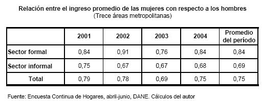 En lo corrido del presente milenio, las mujeres alcanzan en promedio el 75% de los ingresos de los hombres, es decir, se presenta una brecha de ingresos del 25%, la cual es más pronunciada para las trabajadoras del sector informal (31%) que para las del sector formal (17%). Según un reciente estudio para el período 2000–2003, la discriminación de género, corregida por factores no discriminatorios como educación y experiencia, explica el 20% y 21% de la brecha de ingresos laborales entre trabajadores y trabajadoras asalariadas y no asalariadas. Incluso, la autora señala que ''en ausencia del componente discriminatorio, a las mujeres asalariadas les deberían pagar un salario mayor que a los hombres; esto es consistente con el incremento en las características productivas, principalmente en los años de educación de las mujeres en los últimos años''.17