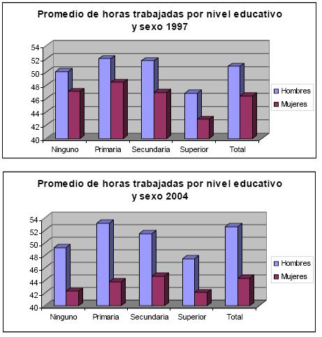 Por niveles educativos, como es de esperarse, se presenta una relativa disminución de las jornadas de trabajo en la medida en que se asciende en la escalera de la escolaridad. Los y las trabajadoras con nivel superior presentan jornadas laborales más cortas, las cuales han tendido hacia la jornada normal de cinco días y medio (44 horas) para los hombres con un promedio de 47,5 horas en el año 2004, y de cinco días normales (40 horas) para las mujeres con un promedio de 42 horas. Para los y las trabajadoras de nivel secundaria y primaria, en 2004 estos promedios son superiores en cuatro horas para los hombres y en dos horas y media para las mujeres.