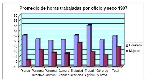 El promedio de horas laboradas por hombres y mujeres para cada categoría ocupacional no presenta mayores diferencias en general. No obstante, es precisamente en los trabajadores de los servicios donde la diferencia de jornadas alcanza su mayor proporción: mientras en 1997 la diferencia era sólo de 3 horas, en el año 2000 llegó a cerca de 10 horas, en 2001 a cerca de 13 horas y en 2004 a cerca de 17 horas. Este incremento de las diferencias refleja, por un lado, el incremento de la jornada promedio de los hombres que pasó de 52 horas semanales en 1997 a más de 59 en el año 2004, y, por otro lado, a la disminución de la jornada de las mujeres que pasó de 49 a 42 horas como promedio semanal. Este comportamiento contribuye a argumentar a favor de la hipótesis de una mayor segregación ocupacional por género que ha llevado a las mujeres a adaptarse a empleos de jornadas de tiempo más parcial y flexible que les permita combinar de mejor manera sus jornadas laborales productivas con las jornadas de trabajo no remunerado y doméstico. Por su parte, los hombres en estas ocupaciones han incrementado sus jornadas ante las necesidades de complementar los ingresos. Para este caso las cifras insinúan un proceso de reversión en los avances hacia la equidad de género toda vez que conlleva un acentuamiento en la división sexual del trabajo, con una mayor presencia de tiempo de los hombres en el campo productivo y una menor presencia de las mujeres en éste, diferencia significativa toda vez que representa dos días laborales normales a la semana.