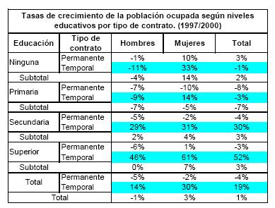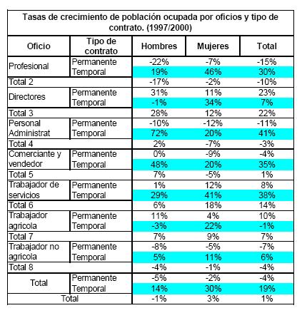 Por tipo de oficios, el trabajo temporal creció prácticamente en todos, pero de manera diferenciada para hombres y mujeres durante los últimos cuatro años del siglo veinte. Para las mujeres, los oficios en que más se incrementó el trabajo temporal fueron el profesional (46%), el directivo (34%) y el de los servicios (41%), siendo este último el que más peso tiene dado que ocupa el 35% del total de mujeres ocupadas, mientras los dos primeros ocupan el 16%. El trabajo temporal femenino también creció entre el personal administrativo y el comercio a una tasa del 20%, sectores que ocupan cerca del 40% de las mujeres.