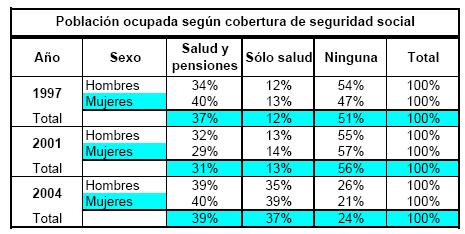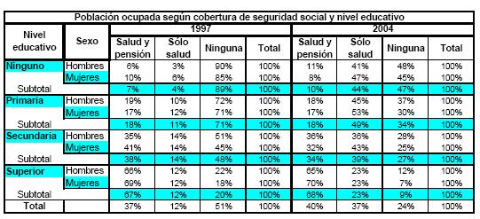 Según nivel educativo, como es de esperarse, la cobertura presenta una relación positiva a medida que se incrementan los grados de escolaridad. Contrasta que mientras de la población ocupada con educación superior, que representa la cuarta parte del total de ocupados, el 68% tiene cobertura en pensiones y salud en el año 2004, sólo el 10% y 18% de quienes se encuentran en los niveles más bajos de escolaridad tienen cobertura, grupo poblacional que representa otra cuarta parte del total de ocupados. Esta es quizás la estructura de inequidad social más evidente que se encuentra en los indicadores de calidad de empleo. No obstante, es en este grupo de población de bajo nivel educativo donde el sistema de seguridad social en salud ha presentado resultados significativos durante el presente milenio. Los ocupados con nivel de educación primaria (22% del total de ocupados) pasaron de tener coberturas del 10 y 12%, para hombres y mujeres respectivamente, a coberturas del 45 y 53% en 2004. En general, los resultados son ligeramente favorables a las mujeres, especialmente en el sector informal, debido a la preocupación pública porque el régimen subsidiado llegue prioritariamente a mujeres en edad reproductiva, lo cual se refleja en un crecimiento sistemático en la cobertura de más de ocho puntos porcentuales durante el período.