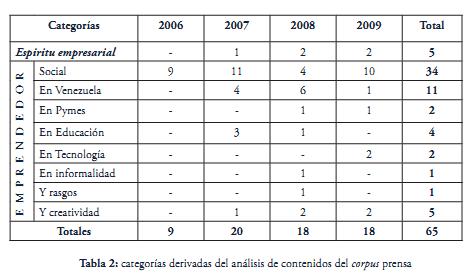Las unidades de análisis fueron los titulares y se registró la lexicalización, entendida como cambio o perdida representativa del significado de una palabra. En nuestro caso los artículos analizados presentan el uso del término de emprendedores un 92,3% mientras que la denominación espíritu empresarial es usada solo el 7,7%, a pesar ser la terminología que recomienda la Real Academia Española de la lengua (ver Tabla 2: categorías derivadas del análisis de contenidos del corpus prensa). El término "emprendedor" está usado con las siguientes acciones verbales "emprender", "aprender a emprender", "para emprender"; otros usos son a través de la adjetivación: "jóvenes emprendedores", "emprendedores sociales", "pequeños y medianos emprendedores", "enseñanza emprendedora", "mujeres emprendedoras" (denominaciones tomadas de los titulares de prensa).