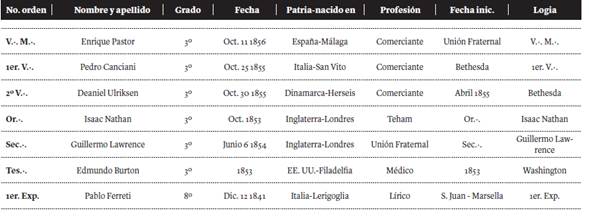 La fundación de la logia Unión Fraternal10 facilitó la iniciación de masones criollos y el ingreso también a argentinos, ingleses, franceses, españoles y alemanes, lo que evidencia el carácter cosmopolita de las logias masónicas. En 1856 fue elegido como venerable maestro Juan de Dios Arlegui, siendo el primer chileno en alcanzar tal designación.
