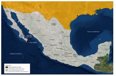 Los Cabos es uno de los cinco municipios de los que se conforma el estado de Baja California Sur. Se encuentra en la parte más austral del estado (ver Figura 1), cuenta con una superficie de 3684 km2, que representan el 5 % de la superficie de la entidad, siendo el municipio de menor territorio del estado. Los Cabos se ubica geográficamente entre los 23° 40’ y 22° 52’ de latitud norte, y 109° 24’ y 110° 07’ de longitud oeste. Colinda al norte con el municipio de La Paz y el Golfo de California, al sur con el Océano Pacífico, al oeste con el municipio de La Paz y el Océano Pacífico, y al este con el Golfo de California y el Océano Pacífico (Ayuntamiento de Los Cabos, 2008).