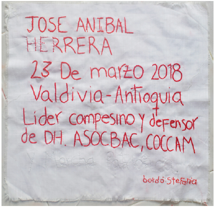 Uno de los mayores retos al iniciar el memorial fue enfrentarnos al registro de un fenómeno doloroso que está sucediendo. Desde el 1 de diciembre de 2016 hemos presenciado semana tras semana noticias, comunicados o denuncias que nos alertan sobre una nueva amenaza o un asesinato de un líder o lideresa social, defensor o defensora de derechos humanos, o firmante de paz. En este contexto, la urgencia por registrar y denunciar públicamente los hechos para evitar la impunidad es inevitable. Aunque entendemos esta necesidad, en el ejercicio de construcción del memorial y archivo textil de derechos humanos buscamos no solo registrar el hecho y las circunstancias del asesinato, sino que también hacemos un ejercicio que nos acerque a la persona y nos hable sobre su historia de vida, sus sueños y las luchas que estaba defendiendo.