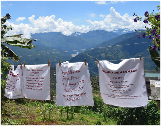 Cuando viajamos a Toledo, dispusimos una galería textil que nos permitió intercambiar saberes e hilar historias entre mujeres de otros rincones del país con las Mujeres Defensoras del Agua y de la Vida - AMARÚ; los pañuelos dispuestos en el tendedero de ropa ubicado en la huerta de la casa de una de las mujeres se ondeaban ante el horizonte de las montañas que arropan al río Cauca. Las mujeres de AMARÚ los leyeron uno a uno, tal vez con sobresalto de encontrar el nombre de alguien cercano allí. De repente, escuchamos a una de ellas leer pausadamente y en voz alta: “Hugo Albeiro George Pérez” (ver Figura 4); se detuvo y dijo, bajando la voz: “ese es mi papá”.