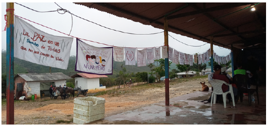 El hilo rojo sirvió como puente para remendar colectivamente la memoria de uno de los líderes sociales del memorial, y para saber que sus acciones de defensa del territorio y cuidado de la vida dejaron un vacío en su compañera, pero también el legado de la fuerza para seguir defendiendo la permanencia digna en el territorio. Por eso, como dispositivo de memoria, cuando El Ojo de la Aguja viaja a los territorios, activa dolores, recuerdos, historias y trayectorias más allá de lo que nos dicen los pañuelos, posibilitando un ejercicio de memoria que se hace necesario desde lo colectivo y desde distintas narrativas a partir de lo textil. En la vereda La Plancha, de Anorí, la exposición de los pañuelos en el Espacio Territorial de Capacitación y Reincorporación (ETCR) Jhon Bautista Peña (ver Figura 5) convocó a varias organizaciones que, diversas como su territorio, son la expresión de resistencia y defensa de una vida en dignidad. El Ojo de la Aguja tuvo gran acogida y generó asombro entre los hombres y mujeres firmantes de paz, pues aun cuando insisten en otro país posible, los nombres de las personas asesinadas les recordaron los daños que han dejado los incumplimientos del Acuerdo de Paz. Es así como el memorial es el relato de una guerra que continúa y se transforma, minando el camino de la transición política hacia la construcción de una paz estable y duradera. En este lugar se activó el recuerdo esperanzador de un Acuerdo de Paz como camino de superación del conflicto y la violencia política, pero que por la falta de voluntades en su implementación ha sumado más dolores a un país ya herido.