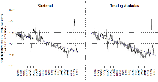FIGURA 1 Coeficiente de Gini del ingreso laboral por hora, nacional y total 13 ciudades, 2001-2021, DANE ECH y GEIH