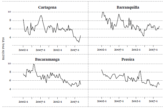 En las cuatro ciudades estudiadas se evidencia una reducción en la desigualdad salarial durante las últimas dos décadas. La figura 2 reporta las series de tiempo de las razones entre los percentiles 90 y 10 de la distribución empírica del ingreso laboral por hora. La razón pasa de 8,33 a 4,36 en Cartagena; de 8,67 a 6,64 en Barranquilla; de 7,64 a 5 en Bucaramanga; y de 8,66 a 5,02 en Pereira. Así, la mayor reducción de la desigualdad se presentó en Cartagena, mientras que la más pequeña se dio en Barranquilla. Además, la mínima desigualdad en las cuatro ciudades se presentó en Cartagena en el periodo 2018-2, con un valor de 2,71, y la máxima se presentó en Barranquilla en el periodo 2002-2, con un valor de 10,04. A pesar de que el comportamiento de estas series de tiempo es muy ilustrativo, cabe recordar que el objetivo del estudio es identificar los determinantes próximos de los cambios observados en las distribuciones del ingreso laboral.