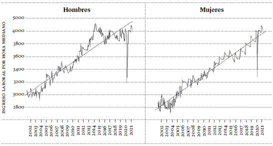 Para ilustrar los efectos de localización y de escala, la figura 3 presenta la localización del ingreso laboral, medida por la mediana de la distribución del ingreso, para el total de las 13 áreas metropolitanas de Colombia. Las medidas están desagregadas por género, lo que permite llevar a cabo un análisis preliminar de las particularidades del mercado laboral de las mujeres. La tendencia de cada medida es clara. La mediana del ingreso por hora aumentó de manera sostenida durante todo el periodo bajo estudio: pasó de 2990,96 pesos para los hombres en el 2001 a 4034,92 pesos en el 2021; y de 2812,55 pesos para las mujeres en el 2001 a 4034,92 en el 2021. En resumen, el aumento del poder adquisitivo de los colombianos fue de casi 1300 pesos por hora en el periodo bajo estudio. En términos de las diferencias por género, en el caso de los hombres a partir del 2014 la media pierde su tendencia creciente, mientras que en el caso de las mujeres la media conserva su tendencia creciente en todo el periodo estudiado.
