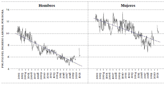 En la figura 4 se presenta la escala del ingreso laboral, medida como el cociente entre el percentil 90 y el percentil 10 de la distribución de ingresos. La escala, que mide la dispersión del ingreso laboral, cayó de manera sostenida en el periodo estudiado. En el 2001, el cociente entre el ingreso del hombre que ganaba más que el 90 % de los hombres y el ingreso del que solo ganaba más que el 10 % de los hombres era de 10,38; mientras que en el 2021 este mismo cociente es de 6,48. En el caso de las mujeres, en el 2001 el cociente entre el ingreso de la mujer que ganaba más que el 90 % de las mujeres; el ingreso de la mujer que solo ganaba más que el 10 % de las mujeres, era de 12,66; y el valor correspondiente en el periodo 2021 es de 10,52. Las gráficas muestran que las brechas en los ingresos de ambos géneros han tendido a cerrarse en el periodo estudiado, y que la escala de los ingresos laborales de las mujeres es más alta que la de los hombres para todos los periodos bajo estudio. Además, es importante notar que la escala de la distribución de las mujeres en 2021 está por encima de la escala de los hombres en 2001. Esto es, a pesar de que en los últimos 20 años la desigualdad por ingreso de las mujeres ha disminuido, esta sigue siendo significativamente alta.