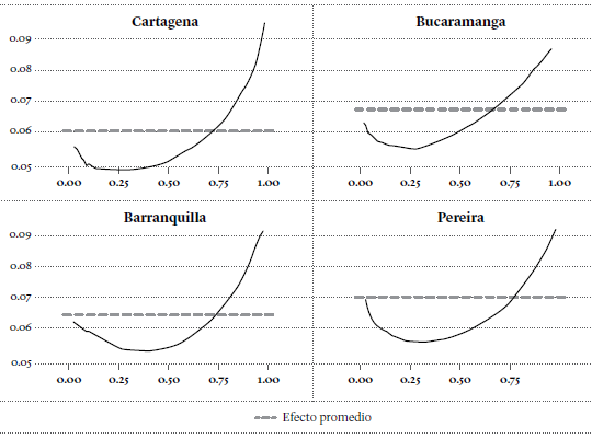 El efecto escala de la educación es de 4,82 % en promedio. Esto significa que aumentar en un año la educación de todos los trabajadores traería consigo un aumento de la escala del ingreso laboral del 4,82 %. Las diferencias entre ciudades son significativas, aunque pequeñas en términos cuantitativos. A este efecto regresivo de la educación sobre la desigualdad se le conoce en la literatura como paradoja del progreso: si bien un incremento de la educación de todos los trabajadores trae consigo un aumento en el ingreso laboral promedio, el aumento es mayor para los trabajadores en el extremo superior de la distribución de ingresos que para aquellos en el extremo inferior de la distribución, lo que produce un aumento en la desigualdad. Un efecto similar y ha sido documentado recientemente por Ferreira et al. (2021) en el caso de Brasil.